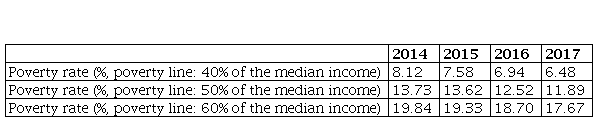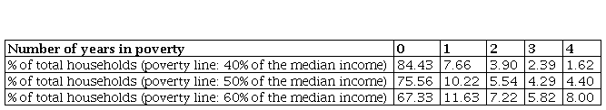 Table 2 shows the share of total households by the number of years their income falls below the poverty line. More than 75% of the households are non-poor; in other words, their income never falls below the half of the median equivalent income. Note that only 4.4% of households are chronically poor even though the poverty rate is above 11% throughout the period of 2014-2017. Ten percent of households experience poverty only in one year, and the share of households that have an income below the poverty line for two or three years is around 5%. This table alone shows us most of the poverty is transitory even when the 60% of the median income is used as the poverty line. Although the data set allows us to monitor the change in the income of households only for a period of four years, setting the poverty line to three different levels would help us capture smaller changes in income and provide robustness to our results.