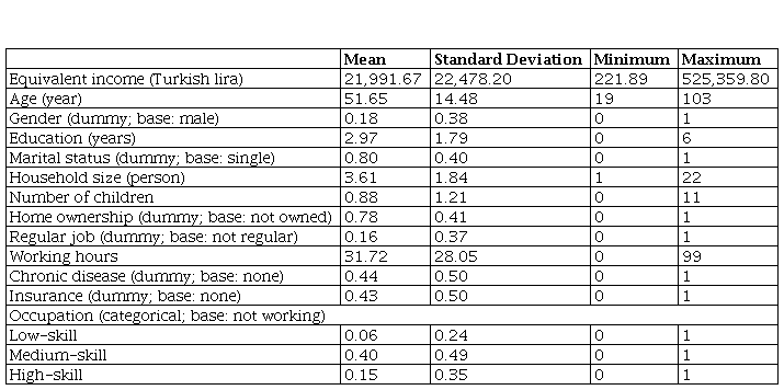 Using the data, we created the variables in Table 3 to use them in explaining the poverty situation of households. Some of the variables are related to the household head. They are age, gender, education, marital status, regular job, occupation, working hours, chronic disease, and insurance. Age is a numerical variable; gender is a dummy that takes the value zero for male household heads. We also checked the non-linear effects of the age, but results show that these are not significant. Education is measured in years. Marital status is a dummy variable with value zero for single household heads. If the household head has a regular job, which is a long-term paid job or their own business rather than a seasonal job, then the regular job dummy is equal to one.