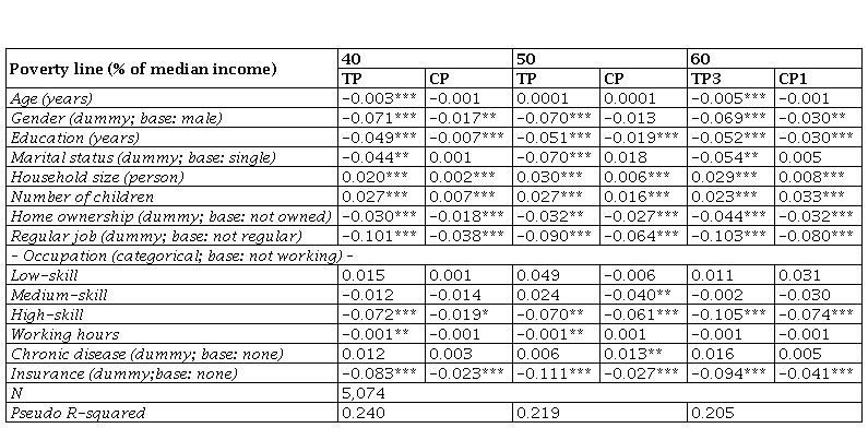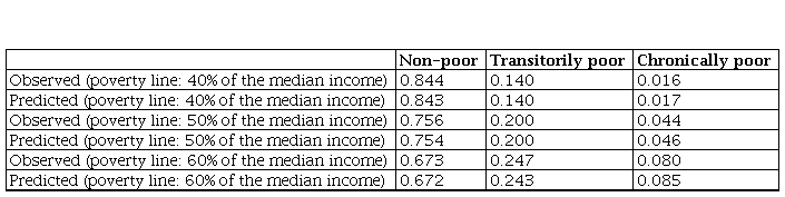 A multinomial logit estimation of the poverty dynamics yields statistically significant results. Table 4 presents parameter estimates for the transitorily poor and chronically poor categories while the non-poor is the base category. The model with 5,074 households has pseudo R-squared of 0.219 and most of the estimates are statistically significant at 1%. We report average marginal effects which are the simply the sample average of the partial effects computed for each of the households. As a robustness check, we also report the same analysis with poverty lines set at 40% and 60% of the median equivalent income.