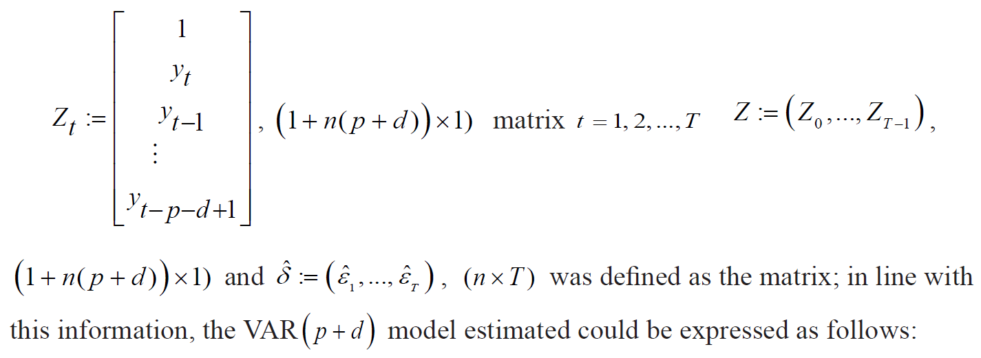 In the model, p represented the optimal lag length, and d represented the maximum degree of integration. Before making an estimate, some definitions were made for the sample size T. Here the matrix matrix is expressed as follows: