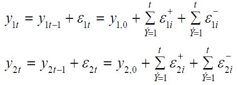 Tests developed for causality analysis (Hacker & Hatemi, 2006; Hsiao, 1981; Sims, 1972; Toda & Yamamoto, 1995) accept that the effect of positive shocks is the same as the effect of negative shocks. However, in financial markets, in the presence of asymmetric information and the heterogeneity of market participants, positive and negative shocks of the same magnitude do not draw similar reactions. In this case, the results obtained from the aforementioned tests can be misleading. It was first suggested by Granger and Yoon (2002) that the relationship between positive and negative shocks could differ from the relationship between variables. The researchers stated that the economic series are cointegrated when they react to shocks together; when they react separately, there cannot be a cointegration relationship between them. Therefore, they separated the data into cumulative positive and negative changes and examined the long-term relationship between these parts. Hatemi-J (2012) adapted the Granger and Yoon (2002) approach for causality analysis. The aim of this asymmetric causality test is to find the hidden structure that will help illustrate the dynamics of the series as in the cointegration analysis of Granger and Yoon (2002) and allow the development of predictions for the possible future. Hatemi-J (2012) defined the two series Importar imagenand Importar imagen, whose causality relationship is investigated, as follows: