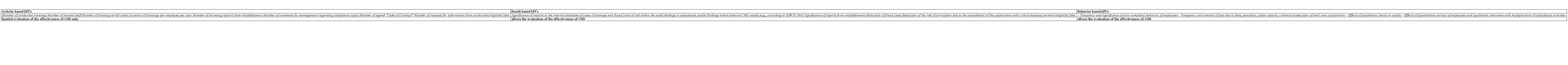 In scientific and practice sources, the segmentation of KPI’s is generally based on activities, results and behavior (refer to Table 1). In order to evaluate (and, later on, also to calculate) the added value of compliance, all KPI’s relevant effects have to be systematically covered. Obviously, effectiveness of a CMS can be derived if KPI’s or realization rates of compliance measures reach high percentages – especially result and behavioral based KPI’s, although this is not always valid, since there exists no ‘absolute compliance’ (refer to Chapter 4.3).