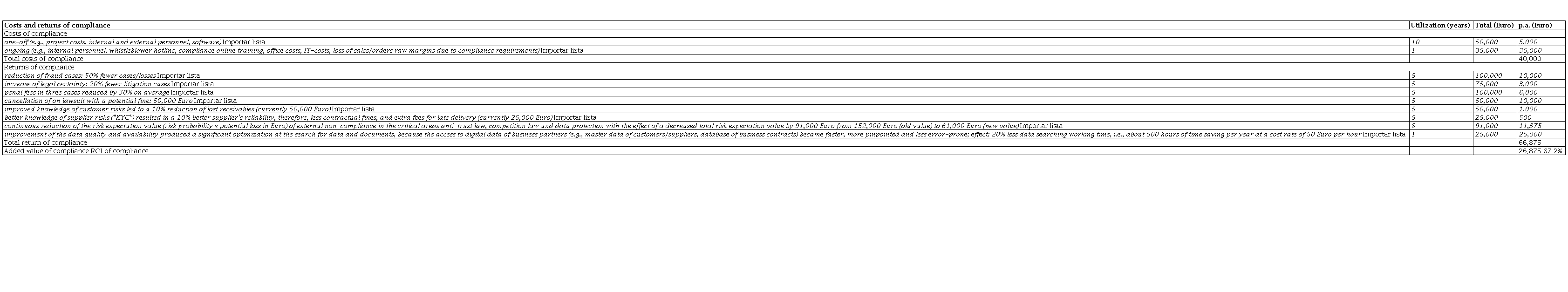 Within the “Business partner compliance project,” the data quality of all suppliers and customers information in the relevant databases had to be updated and corrected. This step led to an improvement of the data quality of all digital data about business partners resulting in a significant time reduction in searching data and documents about business partners. The compliance return is about 20% less searching effort, i.e., 500 hours less working time for data search per year at an hourly cost rate of 50 Euro summing up to 25,000 Euro compliance return per year.