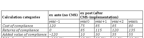 As a possible calculation method of different compliance values, especially within the early development steps of the CMS, the ‘ex ante/ex post’ added value comparison calculation came into focus. This involves determining and comparing the measurable effects on expenses and earnings before and after the introduction of compliance measures. Higher returns from compliance measures than their corresponding costs would then indicate a verifiable monetarized added value of compliance in a time series comparison. In order to analyze an already implemented CMS in the longer term for value creation, the statistical instrument of time series analysis – both retrospectively and in the direction of the future (trend extrapolation) – would be suitable.