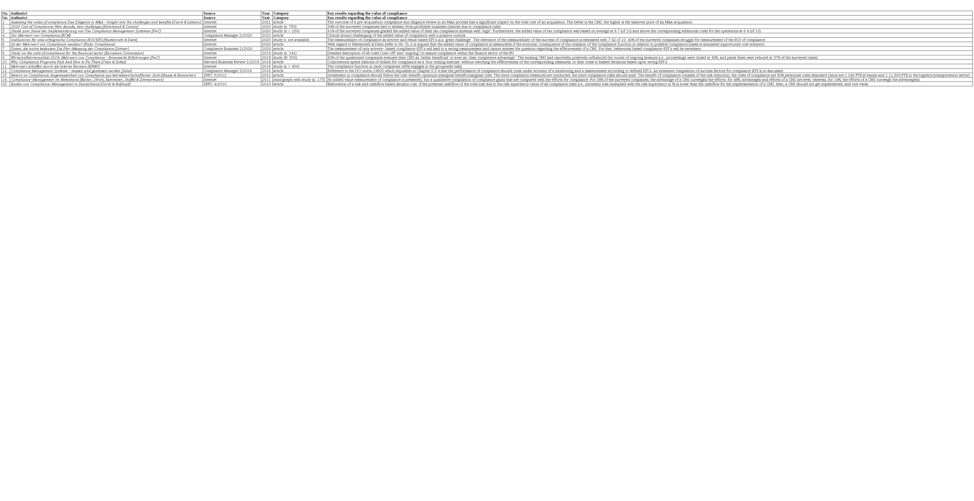 Secondly, beyond the limited sources identified in Google Scholar, the Overview of relevant literature (refer to Appendix 1) encompasses only 15 English and German sources (i.e., monographs, research studies, articles) that are related to the value of corporate compliance, but just one source is based on a quantified approach to measure costs, effects, and ROI of compliance (Hastenrath and Diem 2020), and only one other source is from 2021 (Giard and Leblanc).