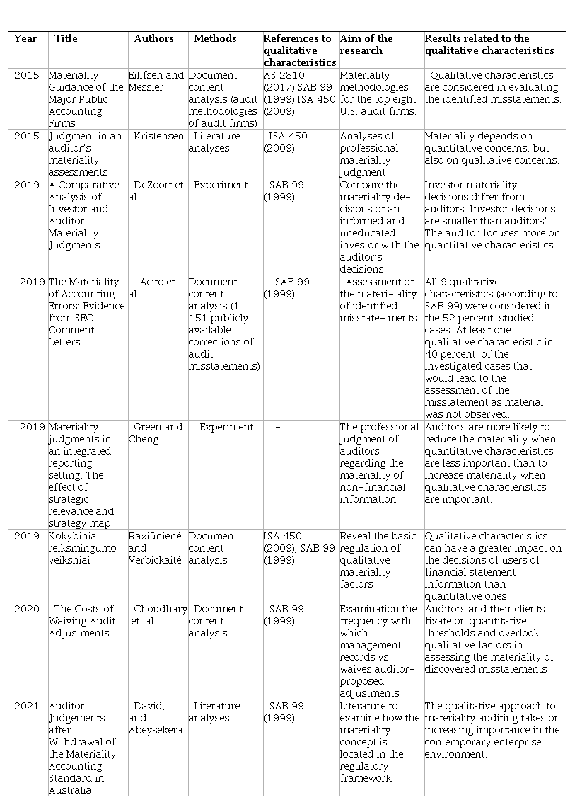 Researchers have begun to examine the qualitative characteristics of misstatements. The initial considerations of qualitative characteristics in literature began around 1970 (Wahdan and Hassan, 2019). Nevertheless, more detailed research has been carried out only recently. The main and most recent research of or related to qualitative characteristics are presented in Table 1.
