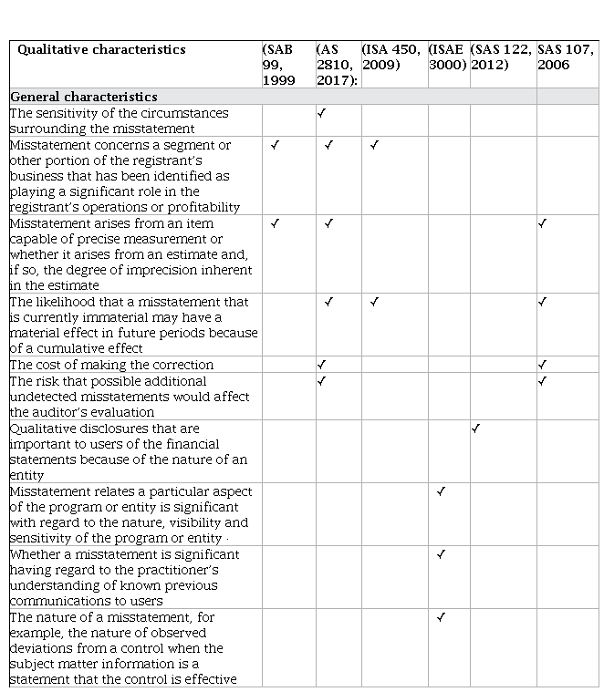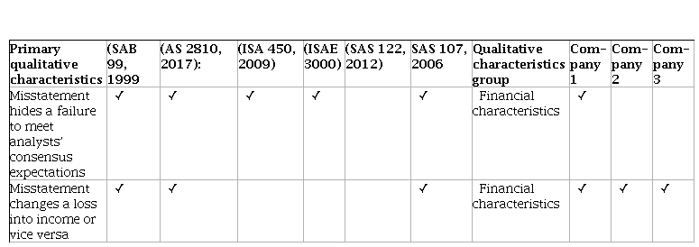 factors (Acito et. al., 2019) found that management of companies under audit consider all qualitative characteristics (according to the characteristics presented in SAB 99, 1999) only in a fraction of situations, while as many as 40 percent of the investigated cases did not adhere to at least one qualitative characteristic. The results of other researchers (DeZoort et. al., 2019;Green and Cheng, 2019) also show that auditors rely more on quantitative characteristics and that insufficient attention is given to qualitative characteristics. On the other hand, there are opposite research results. In 2015 Eilifsen and Messier (2015) found that qualitative characteristics are being considered by auditors when assessing identified misstatements, but Eilifsen and Messier investigated just the methodologies that auditors apply, not the factual audit data.