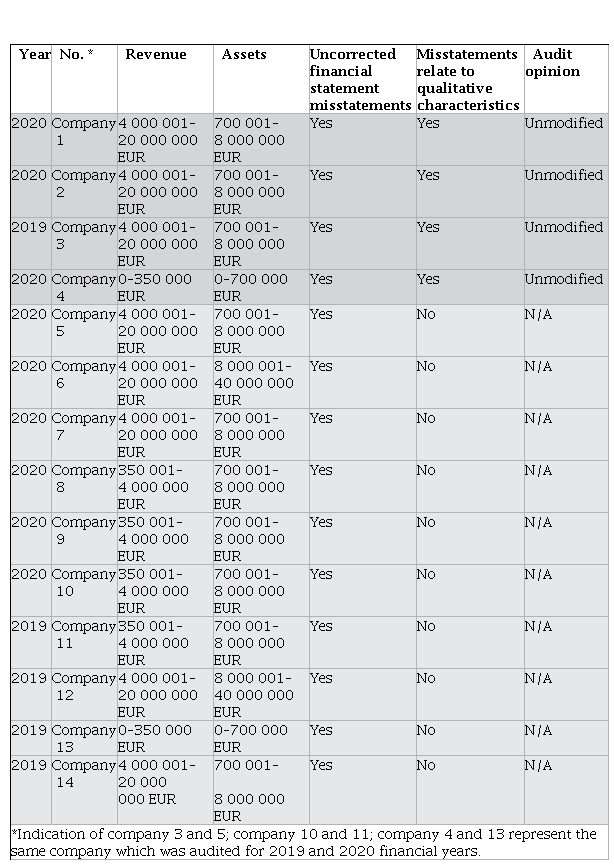 First of all, the grouping of the obtained factual audit data was performed. Not material (by auditors’ consideration) misstatements (meaning they were not corrected in financial statements) were found in fourteen audits (out of all audits performed by one audit company for 2019–2020 financial years). These are misstatements that indicate that there are misstatements of a quantitative and/or qualitative nature, but in the auditor‘s professional judgment they do not affect users of the financial statements and are therefore not corrected in the financial. As the purpose of the study is to assess whether there are in fact primary qualitative characteristics that the auditors would not consider, only these fourteen companies with unrecorded misstatements were selected for the second phase of the study (Table 4).