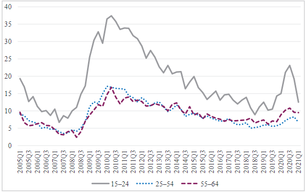 However, the unemployment rate did not grow uniformly in all age groups. The unemployment rate during the year (comparing 2020 Q2 with 2019 Q2) increased by 10.2 percentage points in the 15–24 age group, by 1.2 percentage points in the 25–54 age group, and by 4 percentage points in the 55–64 age group (Figure 1). At the end of 2020, the unemployment rate in the 15–24 age group was 19.2% (+ 4.9 percentage points compared to the end of 2019 when it was 14.3%), in the group of 25–54 years – 7.9% (+2.2 percentage points compared to the end of 2019 when it was 5.7%), and in the 55–64 age group – 9.6% (+2.7 percentage points compared to the end of 2019 when it was 6.9%) (Figure 1). Thus, the unemployment rate increased the most among the youngest people in 2020, while the unemployment rate among older people aged 55–64 increased similarly to that in the 25–54 age group. Thus, unemployment rate data do not show a more negative impact on the elderly than on other workers.