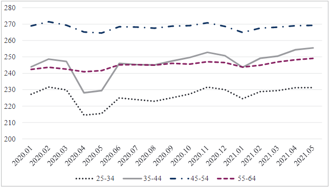 In the first months of quarantine, the number of insured persons who worked in Lithuania for the whole month decreased. The fall was different in different age groups, in April, compared to February, the number of insured persons aged 25–34 decreased by 7.4%, those aged 35–44 – by 8.3%, those aged 45–54 – by 2.3%, 55–64 year – 1.1% (Figure 2).