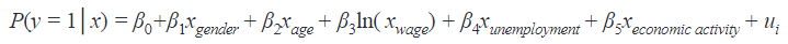 A linear probability model and binary probability models will be developed for Lithuanian data. The linear probability model is defined as follows: