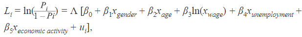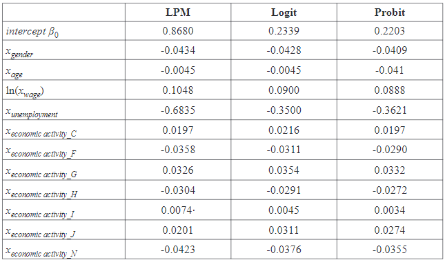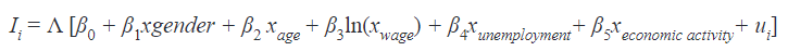 The variable xgender is a dummy variable with being 1 if an individual is a man and being 0 if an individual is a woman. The variable xage is an individual’s age that is from 55 to 64. The variable ln(xwage) is a logarithm of wage in February of 2020. The reason for such transformation has to do with the functional form of the effect, as for a person earning a very low wage and a person earning a very high wage, the additional 100 Eur in salary do not hold the same significance. Therefore, the logarithm is one way to capture such an assumption of diminishing returns. The variable xunemployment is a dummy variable with being 1 if an individual received unemployment benefit during pandemic and being 0 if an individual did not receive unemployment benefit. The variable xeconomic activity is a dummy variable being 1 for analyzed economic activity and being 0 for all other remaining activities. Each economic activity was included in the regression separately (with being 1), with all other economic activities being 0. In the results, this variable is denoted by abbreviations, which will mean: xeconomic activity_C – manufacturing, xeconomicactivity_F– construction, xeconomicactivity_G– wholesale and retail trade, xeconomicactivity_H – transportation, xeconomicactivity_I– accommodation and food service activities, xeconomic activity_J – information and communication, xeconomic activity_N – administrative and support service activities. The logit model for this study can be simply written as follows: