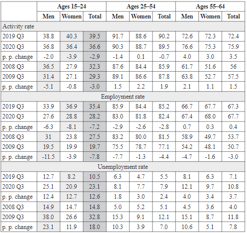 Comparing the impact of Covid-19 on activity and employment, the third quarters of 2020 and 2019 are compared. Activity rates during the Covid-19 pandemic also fell more among young people than among older onexs (Table 1).
