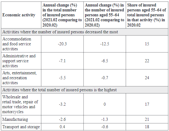 The highest share of insured persons aged 55–64 among all insured persons is in water supply activities (38%), electricity and gas supply (34%), education (33%) and human healthcare activities (30%), while the lowest in information and communication (7%) and financial and insurance activities (9%). During the year, the number of insured persons decreased the most in accommodation and food service activities (–20.3%), administrative and support service activities (–7.1%) and arts, entertainment, and recreation activities (–5.5%), and the number of insured persons aged 55–64 in these activities decreased by 12.5%, 6.5% and 0.7%, respectively (Table 2). In these activities, the share of older insured persons amounts to 15–24%. In the activities where the largest number of insured persons work, for example wholesale and retail trade or manufacturing, the number of insured persons decreased by about 3% (Table 2). Most insured persons aged 55–64 work in manufacturing, education and wholesale and retail trade. Thus, the share of older people working in the most affected quarantine activities is not extremely high, and their numbers in those activities have decreased at a similar rate as people in other age groups or less. Thus, these data also do not show a relatively greater negative impact on older labor market participants.