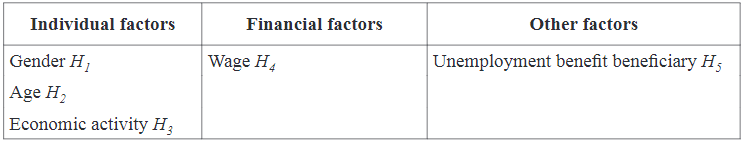 Other factors. If an individual loses their job and qualifies for unemployment benefits, they can receive these benefits for 9 months. The unemployment benefit factor is included to determine whether people who began receiving unemployment benefits last year returned to the labor market at the beginning of 2021. In the light of the foregoing, the following hypothesis is formulated:
