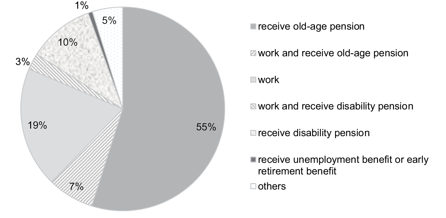 Second, ten percent of older people receive disability pensions and do not work. This large number surprises and suggests that the disability pension in Lithuania is one of the more viable alternatives to labor income among older people. About one percent of elders receive early retirement benefits. The rest 5 percent of elderly are neither recipients of social insurance benefits nor employees. For example, these people can be long-term unemployed or recipients of social assistance benefits, but this remains undefined within the framework of this study.