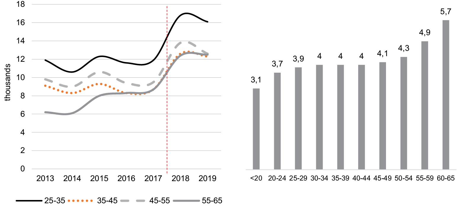 In the overall structure, senior recipients increased from 17 percent in 2013 to 23 percent in 2019. All change can be explained by an aging population because in the structure of population, the share of older people aged 55–64 increased by the same 6 percentage points.1