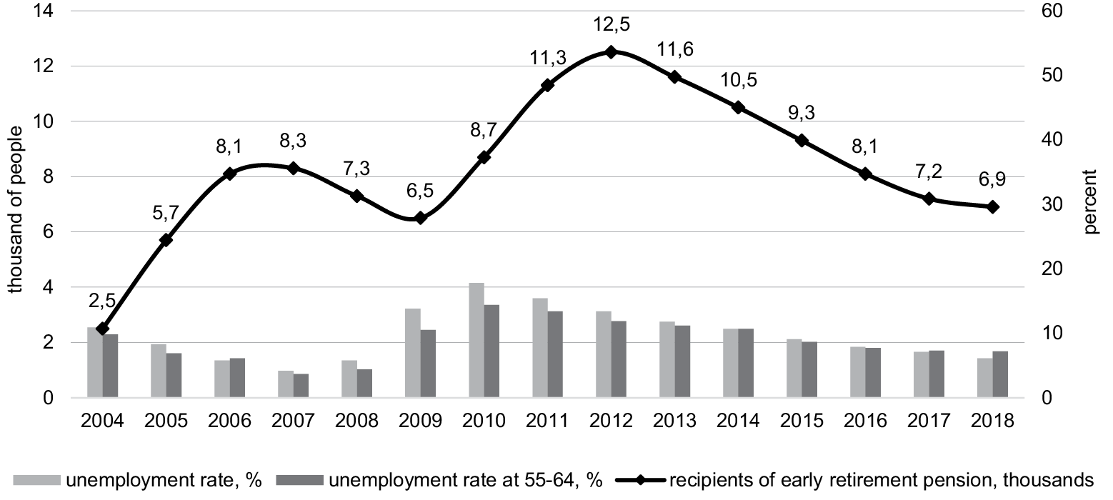 The scale of early retirement recipients in Lithuania is small, but those receiving these pensions choose this alternative because of the inability to stay in the labor market. In Lithuania, a person is eligible for early retirement pension if they are less than 5 years from retirement age, have an obligatory retirement record, have no other income, and do not receive any other pension or benefit.
