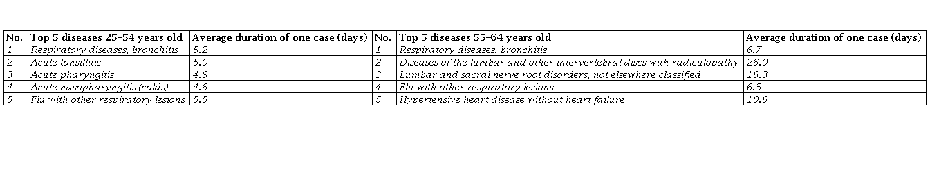 Moreover, the average duration of illness for employed persons aged 25–54 years is 11 working days, while the average duration of illness for employed persons aged 55–64 years is 18 working days. Longer periods of illness lead to more distraction and, in the long term, reduce the chances of staying in the labor market for longer.