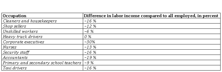 Disabled heavy truck drivers and unskilled workers earn almost as much as the rest of the workforce. The small differences in unskilled labor income are attributable to paying minimum wage to these people, not to productivity. These jobs are low-paid, so both disabled and non-disabled workers work for the same minimum monthly wage. The incomes of heavy truck drivers often do not reflect the real income because they get the big share of their labor income from non-taxable daily allowances. Data about daily allowances is not collected in official statistics. Thus, it is difficult to compare the labor income of heavy truck drivers, as their potential real labor income is probably much higher than that seen in official statistics. Therefore, it is possible that the labor income of disabled people in this area is lower as well.