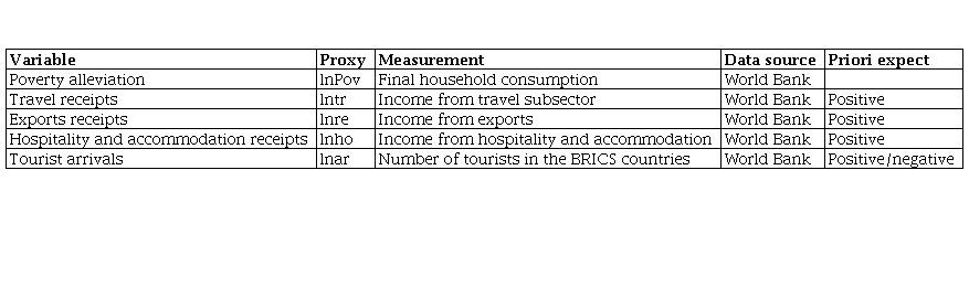 To measure tourism receipts, researches used three variables, namely: receipts from exports, receipts from the travel subsector and receipts from the hospitality and accommodation subsector. An additional tourism variable, tourist arrival, was used as a control variable. Receipts from exports is the income from tourists after buying goods and services produced in BRICS countries (World Bank, 2019). This income is expressed as a ratio of exports in the country. Accordingly, the consumption of goods and services by tourists increases the consumption level, while also reducing poverty in each country. The study expects receipts from exports to be positively related to poverty, implying that an increase in consumption will reduce poverty. This is in line with studies done by Shakouri, Yazdi, Nategian and Shikhrezaei (2017) and Raspor, Stranjančević, Bulatović and Lacmanović (2017). The receipts from the travel subsector are the income from tourists in all the travel services (World Bank, 2019). An increase in the receipts of the travel subsector increases the consumption level which consequently reduces poverty. Thus, researchers expect a positive sign between receipts from travel and poverty. The measure has also been used by Qi and Wu (2017).