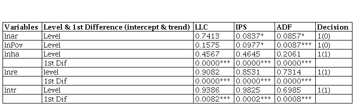 The P-ARDL model proposed by Pesaran (2004) was employed in this study. The panel autoregressive lag model was deemed fit for this study as it accommodates the variables that are integrated at different level that is level zero and one (Chu and Sek, 2015). Furthermore, it allows researchers to analyse both the short-run and long-run relationship between poverty alleviation and tourism receipts in the BRICS countries. When analysing the long-run relationship, the sign of the coefficient and the probability value are the most important indicators. If a coefficient shows a positive sign, then it means a positive relationship exists between the variables under study and the opposite is true. The probability value should be below 10 percent. On the other hand, the short run analysis accommodates the economic shocks between the variables. This is shown by the speed of adjustment that should have a negative sign and significant (Bannerjee et al., 1998). For lag determination, the study employed the automatic lag selection using the AIC criteria. To make our analysis simpler, all the variables were converted into logs. Thus, equation 2 illustrates the P-ARDL model: