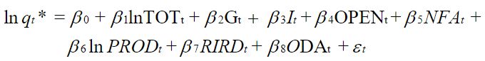 This study estimates the equilibrium RER empirically for each of the countries separately adopting the single equation approach offered by Edwards (1989) and Elbadawi (1994). The approach assumes that the long-run equilibrium RERs is likely to be determined by a set of economic fundamentals. The fundamentals they use include terms of trade (TOT), government spending on non-tradable goods (GN), government spending on tradable goods (GT), investment (I), trade openness (OPEN). However, the theory underlying this approach offers a relatively wide range of fundamentals to choose from in developing the model. In addition to the aforesaid fundamentals, net financial assets position (NFA), the relative productivity in the tradable sector to non-tradable sector (PROD), real interest rate differentials (RIRD), and official development assistance (ODA) to model the equilibrium RER are considered. Due to unavailability of data of government spending on non-tradable and tradable goods throughout the sample period, the data of total government spending (G) is used in the theoretical model of equilibrium RER (q*) determination that takes the following form: