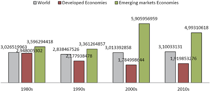When the growth records of EMEs are observed from a longer-term perspective, they maintain a fairly greater growth rate than the developed economies since the 1980s. As Figure 1 illustrates, while there was a declining trend in the growth performance of developed economies, EMEs experienced higher growth over the first three decades of the sample period, of which the 2000s was remarkable, as average GDP growth in these economies picked at just over 5.9%, which was averaged around 1.8% in developed economies over the same period and thus became a major contributor to the growth of the world GDP. In the last decade despite the slowdown, the growth is averaged at almost 5% compared to 1.92% of developed economies. The growth in EMEs has been on a declining trend since the financial crisis of 2008-09, while a modest recovery has continued in developed economies since 2013. Despite the slowdown of economic growth, EMEs still account for over 70% of global growth (IMF, 2018).