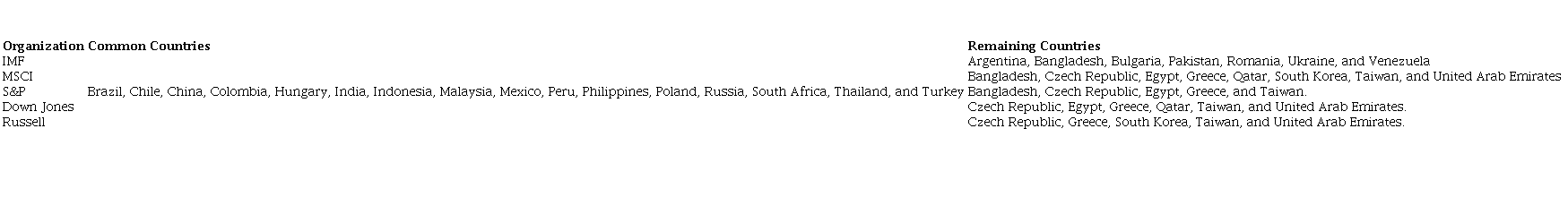 Since an emerging market lacks an official and common definition, there is a disagreement among institutions on the classification of EMEs. Both the IMF and Morgan Stanley Capital International (MSCI) classify 23 countries as EMEs albeit there are some differences between the two charts. Standard and Poor’s (S&P) and Russell each classify 21 countries as EMEs, while there are 22 EMEs in Dow Jones’ list. Table 1 offers a list of common countries that all five institutions classify as EMEs, and the remaining countries are classified by the individual institution as of 2016.