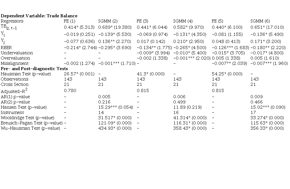 Note *, **, and *** indicate statistical significance at 1%, 5% and 10% levels, respectively. Figures below the coefficients in parentheses are t-statistics.Concerning the estimated coefficients, most of them bear theoretically expected signs. The significant positive lagged trade balance coefficients for all specifications imply that the trade balance of the current period is stirred by the increase in trade balance at the initial period. Coefficients accompanying the home real income are negative for all specifications but insignificant for standard FE estimates and significant for SGMM estimates that vary marginally. 1% increase in home real income causes the trade balance to fall by 0.14%. Except for Model 1 (in Column 1), the standard FE estimators assert an insignificant positive coefficient of real income of the rest of the world, however, the coefficients are significant and positive for all SGMM estimates, which indicates that trade balance is increased by 0.13% according to the baseline model (in Column 2) responding to 1% increase in real income of the rest of the world.