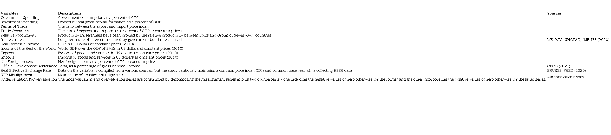 Without ascertaining the equilibrium RER, exchange rate deviations will remain a subjective phenomenon (Edwards & Savastano, 1999; Caporale et al., 2011). Therefore, it is highly necessary to identify the equilibrium RER as well as to examine RER misalignment to evaluate its impact on the trade balance of open economies. Hereby, examining the RER misalignment under different choices of exchange rate and its impact on the trade balance of EMEs is the main purpose of the study. The study will consider economies following floating, free-floating or other managed exchange rate arrangements under monetary aggregate target or inflation targeting framework. EMEs from all major regions of the globe have been covered in undertaking the research. However, inaccessibility of data on some fundamentals restricts the study to attain the REER misalignment estimates for some other EMEs. Accordingly, the study includes 21 EMEs: Argentina, Bangladesh, Brazil, Chile, China, Colombia, Egypt, Greece, India, Indonesia, Malaysia, Mexico, Pakistan, Peru, Philippines, Poland, South Africa, South Korea, Thailand, Turkey, and the United Arab Emirates. Firstly, the study measures the equilibrium RER and corresponding misalignment series of 21 EMEs separately adopting a single equation approach. It then includes them in the trade regression together with undervaluation and overvaluation in order to examine their impact on trade balance of EMEs.