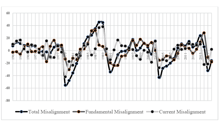 Based on the estimated models above, the equilibrium real exchange rate is calculated, and the divergence between the actual and equilibrium rates is illustrated in this section. The analysis is confined to the long-run solution obtained by the ARDL model for the real effective exchange rate since it passes all the diagnostic tests employed previously. Following the methodology adopted by Clark and MacDonald (1999, 2004), the current and total equilibrium exchange rates between 1965 and 2018 are depicted in Figure 5. It can be noticed that the total equilibrium rate is smoother than the current equilibrium rate over the period examined as the former is calculated using the smoothed values of the economic fundamentals incorporated in the ARDL model. This is done by applying the exponential smoothing method11. Thus, the current equilibrium rate is impacted by the fluctuations experienced within the economic fundamentals incorporated in the estimated model. The equilibrium rates are used to derive the different misalignment measures according to the source of deviation as explained below.