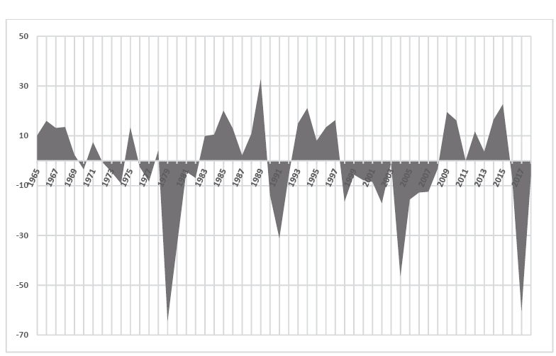Focusing on the types of misalignment experienced by the Egyptian pound over the period (i. e., over- or undervaluation), Figure 7 detects the different phases of misalignment in the real effective exchange rate. When the actual real effective exchange rate is above the equilibrium, it is overvalued, and when it is below the equilibrium, it is undervalued. In particular, there are four distinct phases of overvaluation over the whole period: during the second half of the 1960s, before the implementation of the ERSAP in 1991; between 1993 and 1997; and lastly between 2009 and 2015. The Egyptian pound experienced four main sub-periods of undervaluation: from 1979 to 1982, after the implementation of the ERSAP in 1991, and from 1998 to 2008, in addition to the last three years of the examined period.