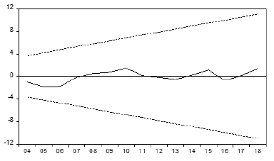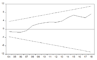 It can be noticed from Figures 1–4 that the two ARDL models estimated in this paper for both the bilateral and effective real exchange rate can pass the stability check since the statistics produced by the CUMSUM and CUMSUMSQ plots lie within the critical bounds of the 5% significance level. This ensures that the coefficients in the two models are stable.
