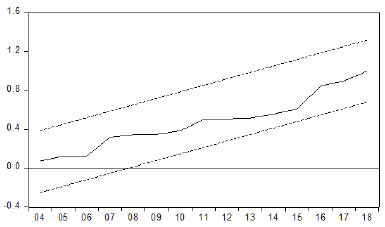 Several tests were conducted to check the reliability of the two ARDL models estimated, one for the bilateral real exchange rate model and the other for the effective real exchange rate. These tests include normality, serial correlation LM and heteroscedasticity tests along with two chief stability tests, which produce recursive estimates and are known as cumulative sum (CUSUM) and cumulative sum of squares (CUSUMSQ). Table 4 and Figures 1–4 depict the results of these diagnostic tests. As outlined in Table 3, the ARDL model for the real effective exchange rate passes through all these tests, which reflects its goodness of fit. The ARDL model estimated using the bilateral real exchange rate is evaluated to be reliable in terms of serial correlation and normality checks. However, the presence of heteroscedasticity is found for this latter model10.