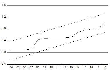 After examining the order of integration of the time-series, the two-step bound test of co-integration was employed. The optimal lag order of the ARDL model was firstly chosen based on the Schwarz Criterion (SC), and the order of the model was selected to be ARDL (3, 3, 0, 0, 3) with maximum number of lags automatically set to be 4 lags. It is then appropriate to move forward to the second step in which the long-run relationship among the incorporated variables is investigated based on the F-statistic of the chosen model. The calculated F-statistic is 6.525, which is above the upper bound critical value at 1% level of significance9.