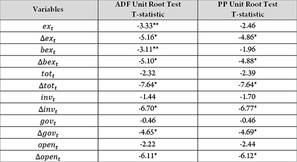 The results of the unit root tests are summarized in Table 1, which shows that both the ADF and PP tests give similar evidence on the level of stationarity for all variables with the exception of the real effective (and bilateral) exchange rate. It can be noticed from the table that while the ADF test reveals the stationarity of the real effective (and bilateral) exchange rate at level only at 5% significance level and at first difference at 1% significance level, the PP test shows that all variables are integrated of order 1 at 1% level of significance. In light of the weak signs of stationarity of the real exchange rate for the ADF test, we cannot be certain about its order of integration, indicating a case that allows for the application of the ARDL methodology, which provides further estimation advantages as explained earlier.