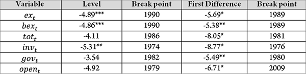 Zivot-Andrews structural break unit root test was equally employed to check for the stationarity results. Table 2 shows the results of Zivot-Andrews unit root test and reveals that the results are mixed as some variables (such as terms of trade, government consumption and openness) are non-stationary at level and are stationary in first difference form, that is, I (1). However, both real exchange rate variables and investment ratio are stationary at level at different critical values. This indicates that the result is the mixture of I (1) and I (0). Therefore, the Zivot-Andrews unit root test also supports the implementation of ARDL approach.