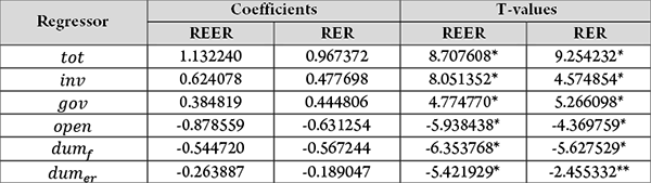 As indicated from Table 3, the variables appear to be statistically significant with signs consistent with economic theory. The terms of trade variable has a positive sign, which indicates a domination of the income effect in the case of Egypt. An increase in the TOT variable by 1% will lead to 1.13% increase in the real effective exchange rate. The coefficient of investment reflects how capital formation stimulates the real effective exchange rate such that an increase in investment variable by 1% causes 0.62% increase in the exchange rate. The government consumption has a coefficient of 0.38, reflecting an appreciation effect of 0.38% on the real effective exchange rate when it rises by 1%. This means that in the case of Egypt, government spending is mainly channeled through the increase in the demand of the non-tradeable sector giving it a larger weight than that of the tradable sector. Trade openness appears to create a depreciation effect, which reflects how commercial policy could be of less support to the import competing industries thus inducing a higher demand for the importables and a deteriorated current account balance. The magnitude of the depreciating effect is nearly 0.88% per 1% increase in the degree of trade openness. Both the dummy variables for the ERSAP and flotation appear to have a negative sign as expected since the two dummies capture the effect of policies that either chiefly or partially were directed to liberalizing and devaluing the value of the Egyptian pound.