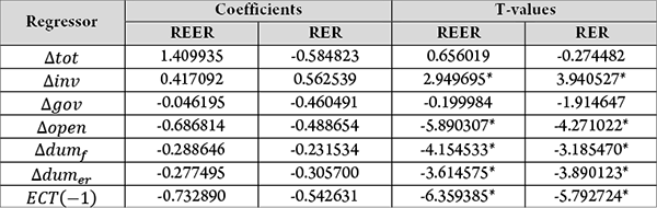 The ARDL short-run estimates are summarized in Table 5. The findings give evidence for a statistically significant and negative error correction term for both the real effective and bilateral exchange rate models. It is concluded that around 73% (54%) of the disequilibrium of the real effective (bilateral) exchange rate is adjusted each year. With the exception of the terms of trade and government consumption, all other variables appear to have a short-run effect on the real exchange rate.