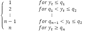 Each value in the time series yt is replaced with an integer (1, 2, ..., n) according to how St relates to the interval specified by the lower and upper bounds q1qn . The choice of the bins is justified by the empirical distribution of the data.