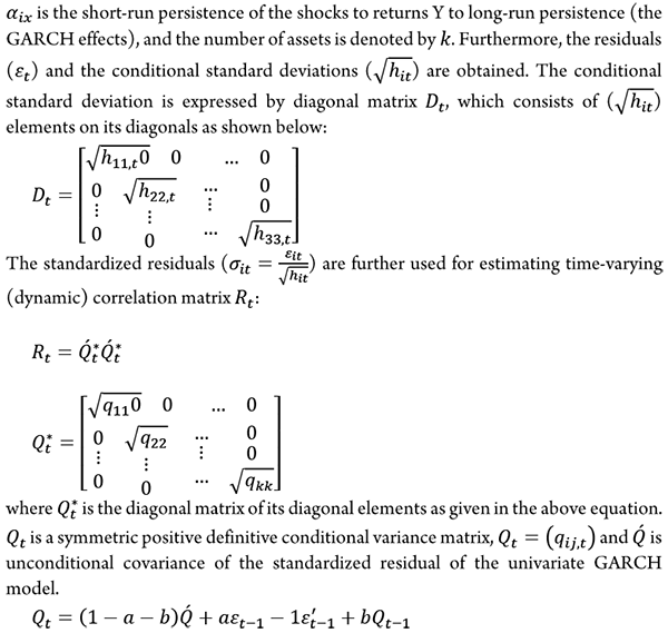The results from the Shannonian entropy and Renyian entropy shown above have a weakness because they are static in frequency and time. For robustness, the linkages between the JSE and ZSE are further re-estimated using the Dynamic Conditional Co-variance (DCC)-Generalized auto-regressive Conditional Heteroscedasticity (GARCH) model of Engle (2002) to address the time-varying volatility and correlations between the two markets. Details on computing the DCC-GARCH model parameters used in this study are outlined in Appendix A. The DCC-GARCH model results showing the dynamic relationships among the different stock indices of the Zimbabwe Stock Exchange and the Johannesburg Stock Exchange are presented in Figure 5.