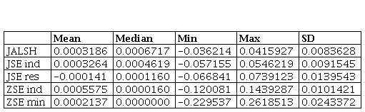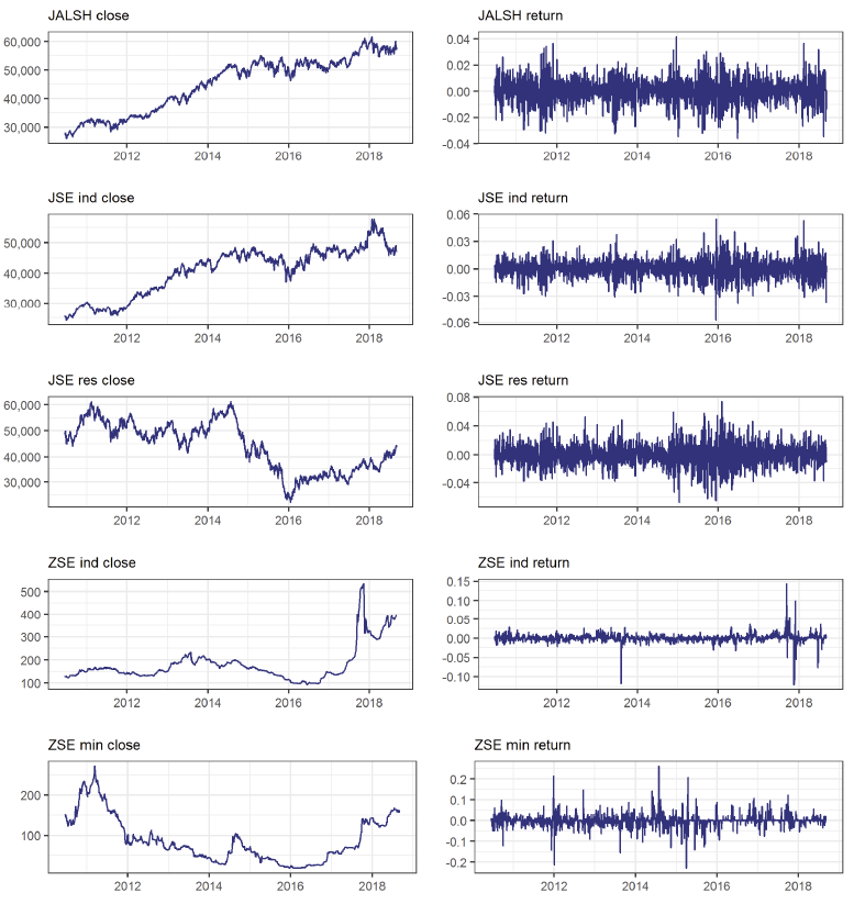 The analyzed dataset consists of data points of three stock market indices of the Johannesburg Stock Exchange and two stock market indices of the Zimbabwe Stock Exchange. The stock market indices from the Zimbabwe Stock Exchange which formed part of this study are the Industrials index (ZSE ind) as well as the mining index (ZSE min), while those from the Johannesburg Stock Exchange are the JSE All Share index (JALSH), JSE industrial index (JSE ind) and the JSE resources index (JSE res). Daily closing prices of the indices were collected from the Iress database. The JALSH index includes 99% of the listed companies of the JSE of the main board and is computed subject to minimum free float and liquidity criteria. JSE res constitutes those companies that form part of the Industry Classification Benchmark (ICB) belonging to the oil and gas as well as basic materials industry. The JSE ind consists of all companies that do not belong to ICB industries: financials, oil and gas as well as basic materials. In the study period, ZSE maintained only two indices: ZSE min, which consisted of all mining companies, and ZSE ind, which included all other companies not included in the former. The inclusion of both ZSE indices was motivated by the desire to have a complete view of the ZSE, while the choice of the JSE indices was motivated by indices that intuitively likely mirror the ZSE indices in terms of the nature and characteristics of the constituent companies.