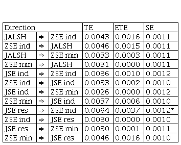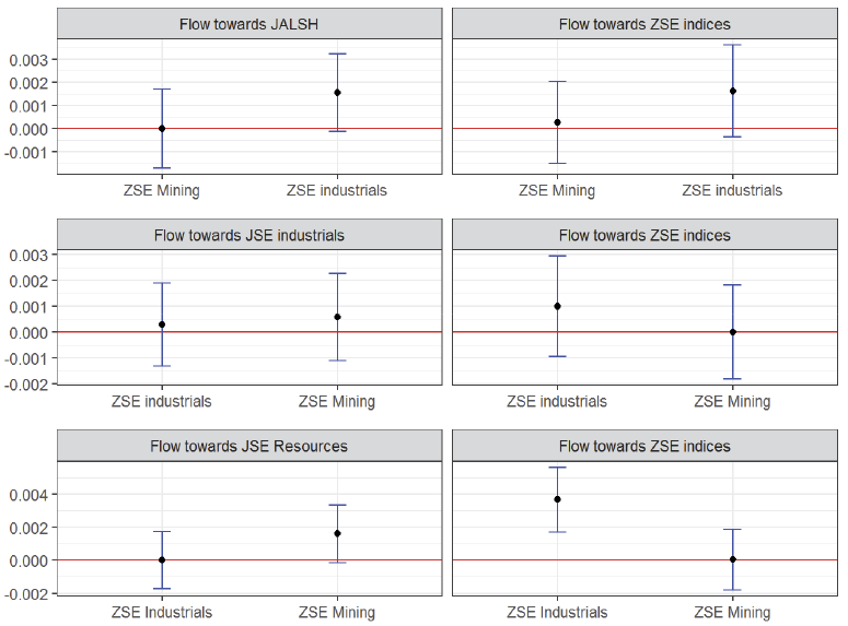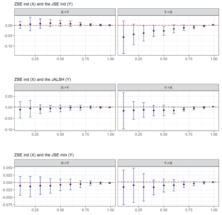 The strength of the relationship between the ZSE indices and the JSE indices using the effective transfer entropy based on the Shannonian entropy are presented in Table 5. The results are based on Equation 4 after the data were shuffled to ameliorate the small sample effects in line with other studies. Table 5 reports the Shannonian transfer entropy estimates as well as the effective transfer entropy (ETE) together with the associated standard errors. Figure 2 reports the estimates of the effective transfer entropy within the 95% confidence intervals for all the indices.