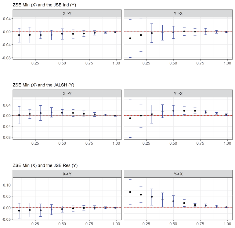 Figure 4 shows the Rényian transfer entropy estimates between ZSE min and the JALSH, JSE ind and JSE res respectively. The top panel shows that there is no significant information flow between ZSE min and JSE ind at all values of q. This confirms the absence of tail dependencies between the ZSE min returns and the JSE ind index returns. However, the middle and bottom panels in Figure 5 show that there are tail dependencies from JALSH to ZSE min as well as from JSE res to the ZSE mining index. There are tail dependencies and significant flow of information from the JALSH to the ZSE min for values of . between 0.6 and 1 and significant flow of information from JSE res to ZSE min for all values of .. Also, it can be noted that for the values of . in which the Rényian entropy estimates are significant, the values of the entropy estimates are all positive. According to Behrendt et al. (2019), positive Rényi transfer entropy implies that the risk about the dependent variable is reduced by knowledge of the other variable. Thus, relative to the significant information flows depicted in Figure 4, the risk about the JALSH can be reduced by knowledge about ZSE min, and the risk about the JSE res can be reduced by knowledge about the ZSE min. However, it can also be noted from Figure 4 that the magnitudes of the Rényian ETE estimates are also very low (less than 0.1) on a scale of 0 to 1 showing that the magnitude of tail dependence is close to zero though significant. Another observation that can be made from Figure 4 is that the flow of information at extreme distributions is unidirectional from the JSE to the ZSE, showing information flow from the more developed JSE to the less developed ZSE.