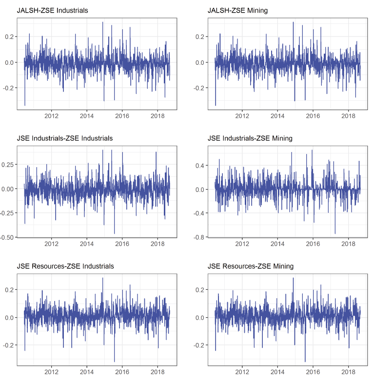 Figure 5 above confirms the findings from transfer entropy estimates on the linkages between the ZSE indices as well as the JSE indices. The correlations among the stock indices are clustered around 0, with the minimum and maximum correlations between -0.3 and 0.3 respectively across the study period. This confirms weak linkages between the Zimbabwe Stock Exchange and the Johannesburg Stock Exchange even using a time-varying dynamic model.