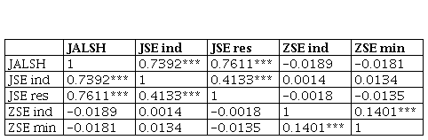 Table 1 shows that the highest mean return was experienced on the ZSE ind (0.056%), while the lowest mean return was experienced on the JSE res (-0.0141%). This shows that the ZSE had better mean returns compared to the JSE during the multi-currency era. The use of the US dollar seems to have instilled confidence in the ZSE and increased demand for the ZSE stocks by foreign investors as well as local investors. However, the standard deviation estimates show that the Zimbabwean market was relatively more volatile than the South African market. Figure 1 also demonstrates the stylized facts of financial returns as there is evidence of volatility clustering on all the return series. Table 2 below shows the Pearson correlation coefficients of the return series of the indices used in the study.