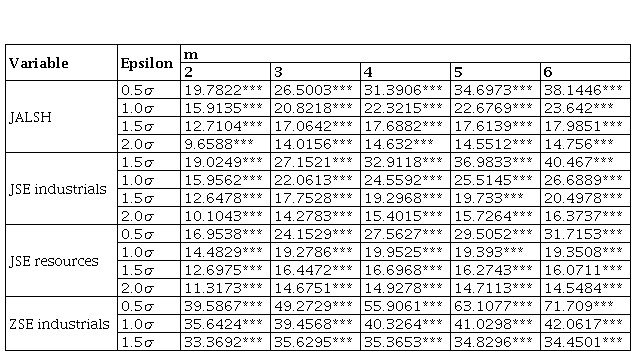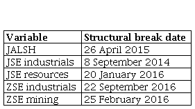 Table 4 also shows that the returns of the JSE and ZSE stock indices have structural breaks, which gives justification against using models that assume linearity and no structural breaks in the variables. Transfer entropy models are therefore appropriate as they are robust to data that exhibits nonlinearities and/or structural breaks.