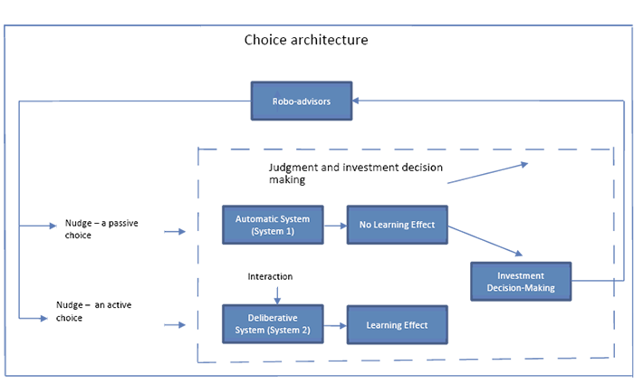 Choice architecture postulates that nudges can influence and improve financial decision-making. It shapes the interaction between the information system, the Robo-advisors, and investment decision-making. Depending on the nudge type, either the automatic system (System 1) or the deliberative (System 2) is activated. If Robo-advisors provide default options and process investment decisions automatically without investors’ involvement, the investors can relinquish themselves and take no part in the investment process. This type of nudging derives from a passive investment approach. An alternative may be to have Robo-advisors provide a few options so that investors have to choose. In this case, the investors take time to think before making the investment decision. We conclude from the above discussion on the theoretical framework that this type of nudging derives from an active investment approach.