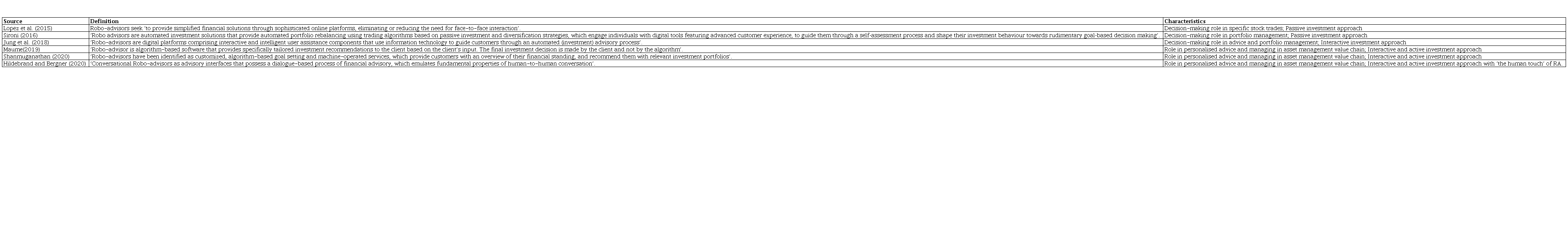 The evolution of Robo-advisors definitions provided in Table 1 indicates how Robo-advisors’ role has been changing from passive investment approach to interactive and active investment approach. One of the first definitions provided by Sironi (2016) suggested that Automated Investment Solutions (AIS) would be a more appropriate name for Robo-advisors as they are neither robots nor advisors, however, “we are aware that AIS would not be a headline stealer because it does not convey the same emotional emphasis as robotics”. The discussion is ongoing whether Robo-advisors are automated asset management service or advisors that leave the final investment decision to the client. When Robo-advisors are fully automated, are they Robo-advisors or, as D’Acunto (2020) suggested, a more appropriate term would be Robo-investors or Robo-managers? The most recent definitions starting with Jung et al. (2018) include an interaction between the Robo-advisors and the investors used in active investing. Hildebr and and Bergner (2020) referred to conversational Robo-advisors that compensate for the lack of ‘human touch’ during the advisory process to provide turn-taking or the presence of social cues throughout the conversation with Robo-advisors. However, current Robo-advisors are not customised according to the personal aims of investors within the framework of individual life-cycle management yet. Usually, the Robo-advisors provide advice only concerning the assets that those Robo-advisors manage. However, more fundamental needs of individuals, like the planning of studies, retirement, real estate, are not addressed yet (Fisch et al., 2019). Based on the evolution of Robo-advisors, as presented in Table 1, and taking into account the broad context of investors’ needs and future development in intelligent data analysis and machine learning, we suggest the definition of Robo-advisors. Robo-advisors are algorithm-based software that interacts like a human, provides specifically tailored rational investment recommendations to the customer and can learn from data. The final investment decision is made either by the client or by the algorithm.